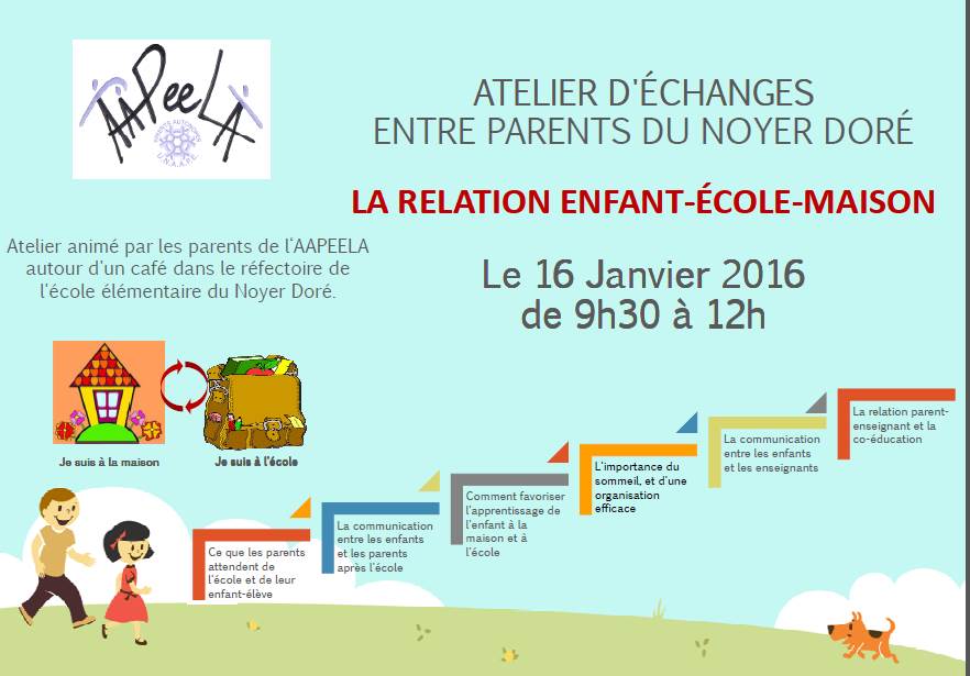 Bonjour à tous, Demain matin, Samedi 16 Janvier 2016, RDV à l’école élémentaire du Noyer Doré à Antony, pour un atelier parents que j’aurai le plaisir d’animer, avec mes collègues de l’équipe de l’association de parents d’élèves AAPEELA ! Au programme : échanges autour de la relation enfant-école-maison, le tout dans une ambiance conviviale autour […]